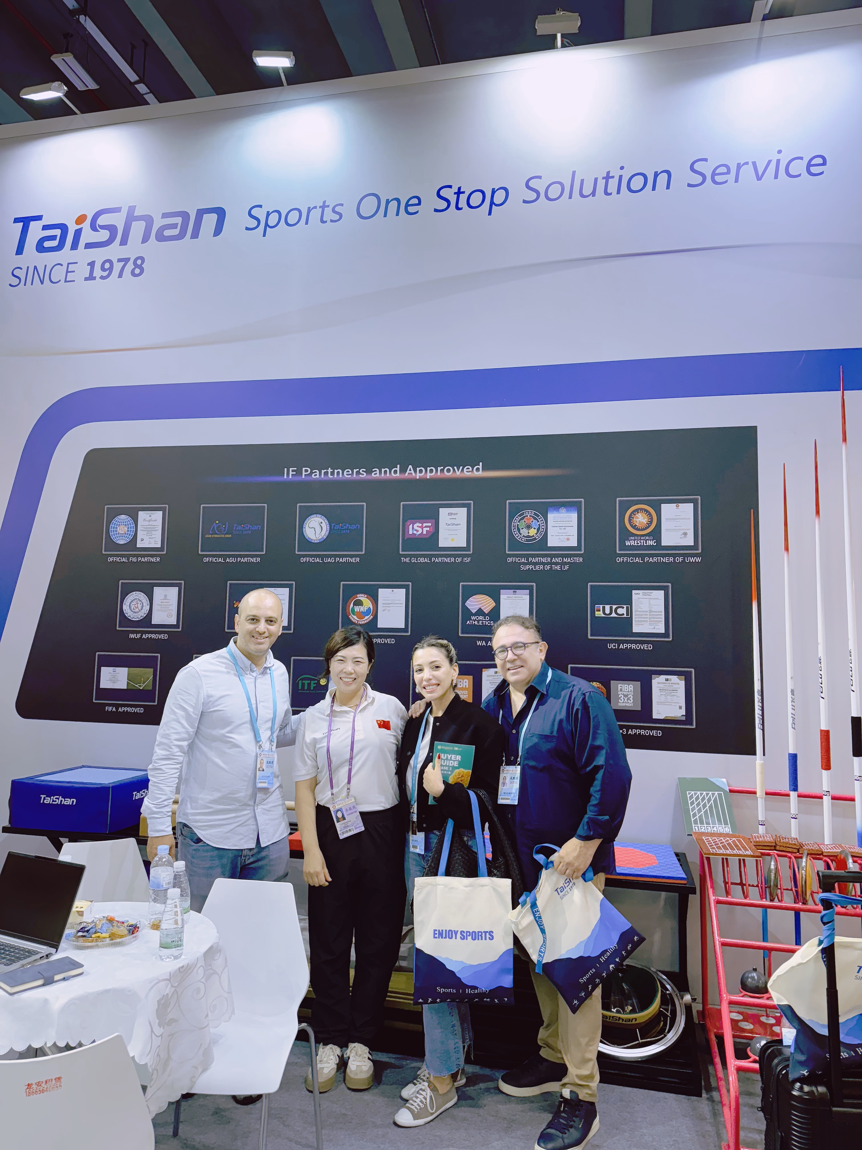 3003新葡的京体育提供的竞技体育器材产品种类齐全、质感细腻、质量优良,碳纤维跳马、摔跤垫、新型武术场地、空手道垫、跆拳道拼接垫、拳击护头(手套)、柔道服等20余种体育器材产品,吸引了众多观展商的目光,收到了良好的参展效果。